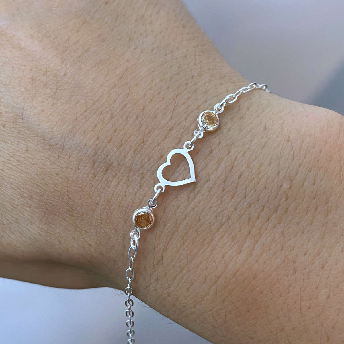 Pulseira Feminina 2 Zircônia Laranja e Coração de Prata 925