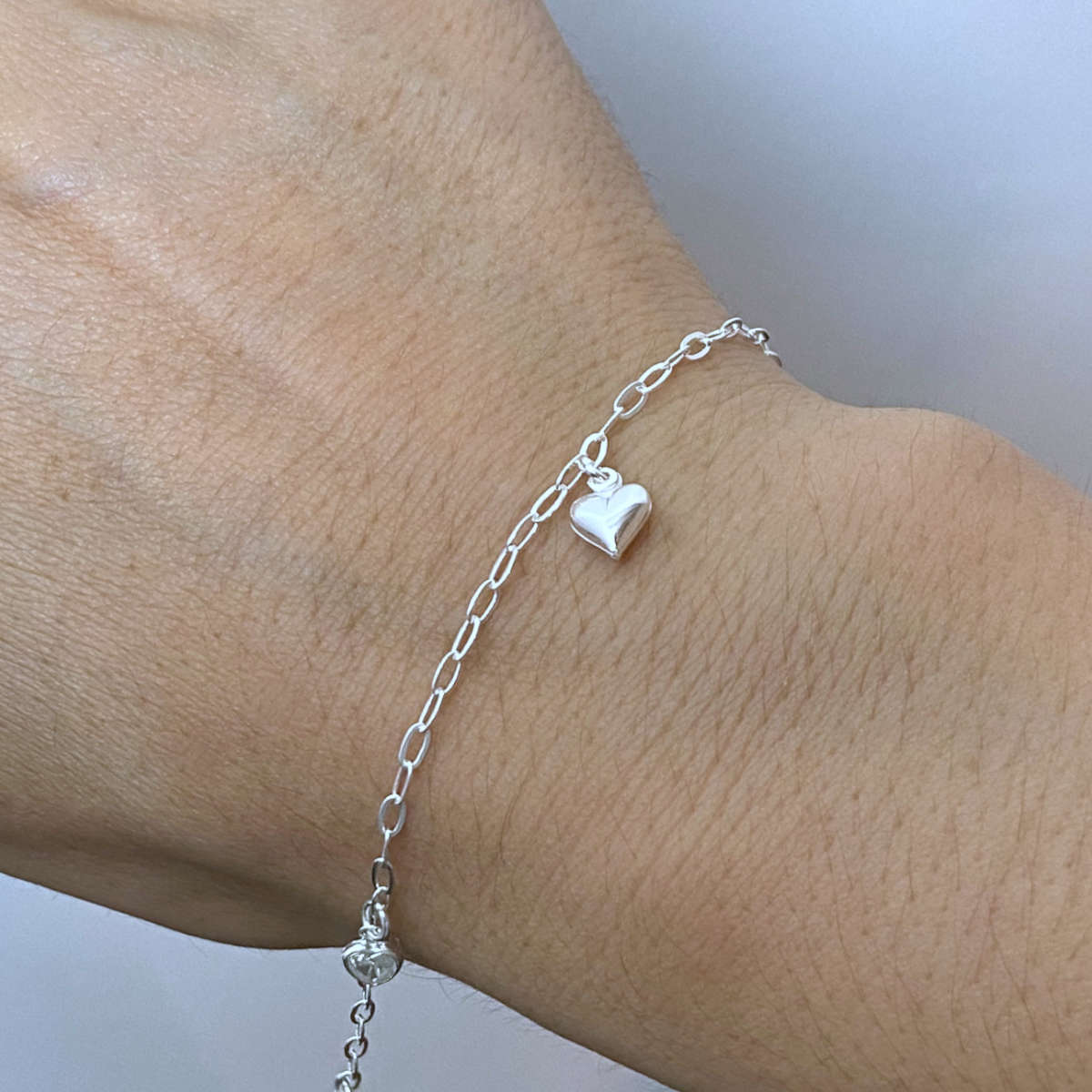 Pulseira Feminina 2 Zircônias e 1 Coração Prata 925 Legítima