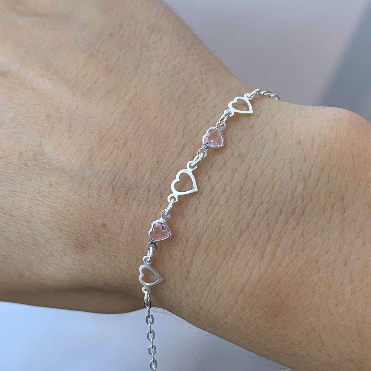 Pulseira Feminina 2 Zircônias e 3 Coração Prata 925 Legítima