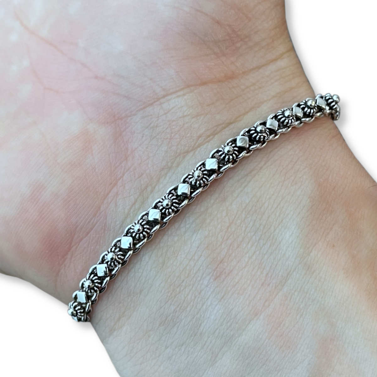 Pulseira feminina modelo bali prata envelhecida com flores e losango, tudo em prata 925, excelente acabamento e garantia vitalícia com relação à autenticidade do material, NÃO é banhado.