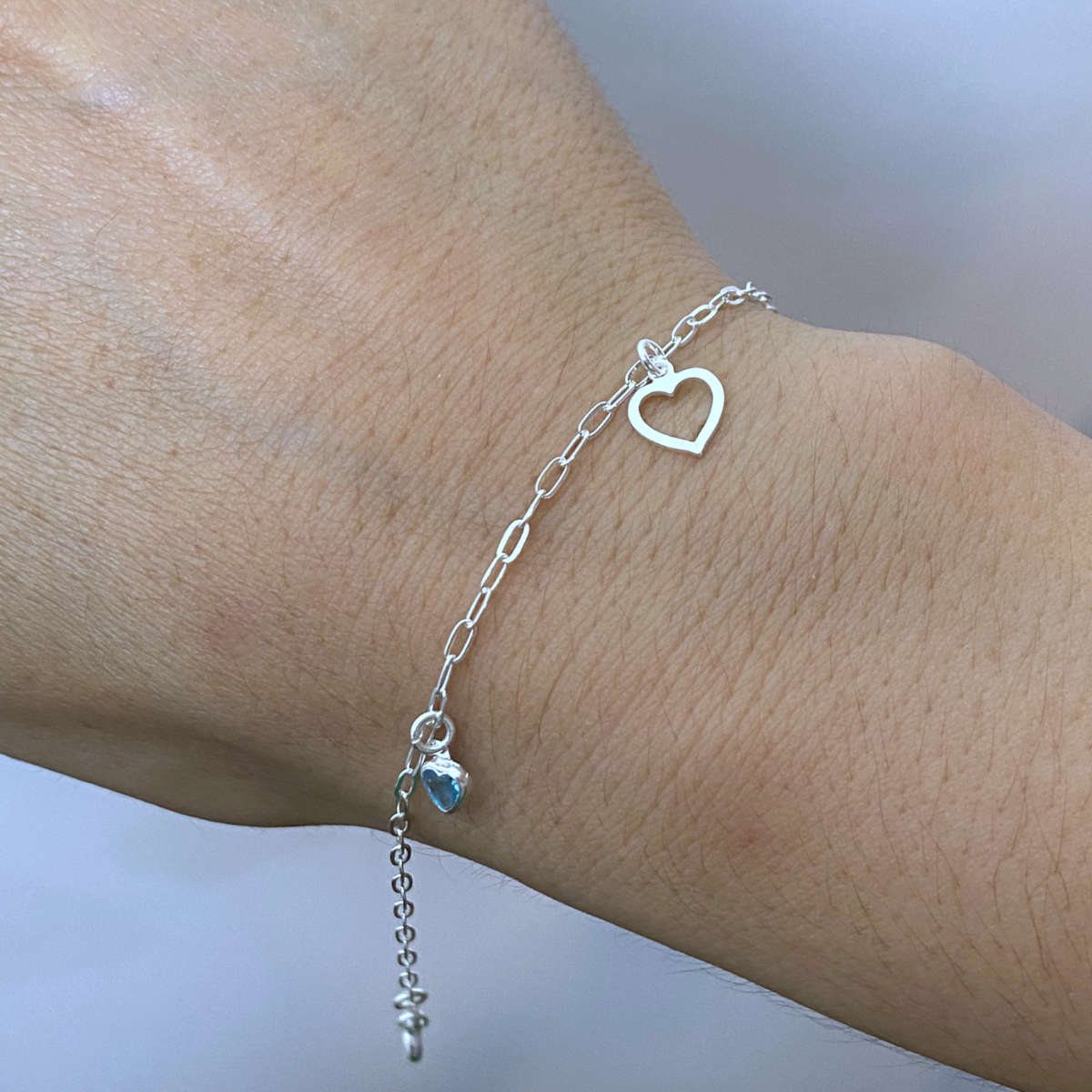 Pulseira Feminina Zircônia Azul e Coração Prata 925 Legítima